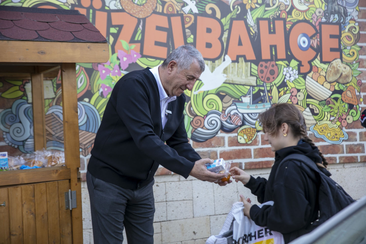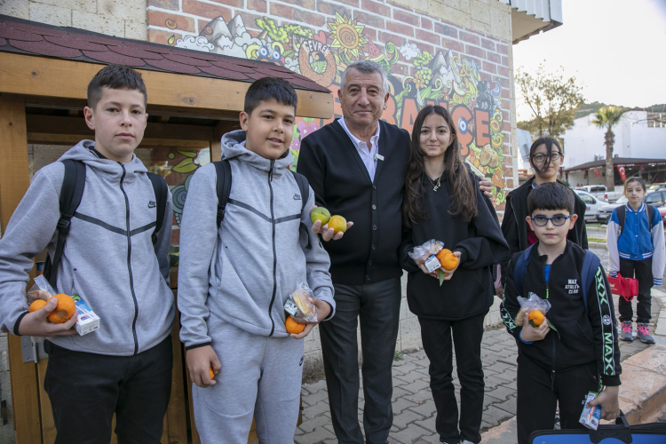Başkan Günay, “Güzelbahçe‘de yaşayan çiftçilerimizin mandalinaları bu sene yine dalında kaldı para etmediği için köylümüz bunları toplayamadı biz de köylümüzün malını alarak ilçemizde bulunan devlet okullarına her gün dağıttığımız simit ve poğaçanın yanında bugün de mandalina dağıtıyoruz. Köylü satamadı biz de onları alıp buradaki çocuklarımıza dağıtıyoruz” diye konuştu.