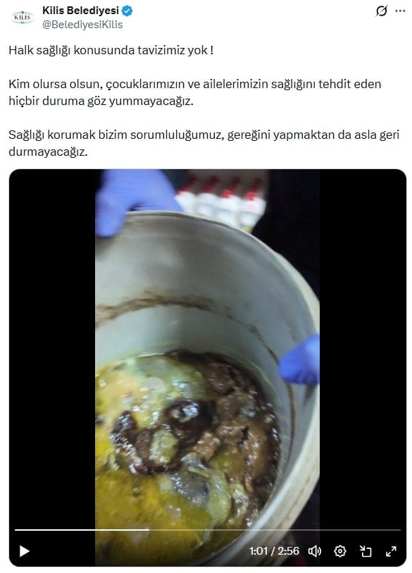 Kilis belediyesi denetim görüntülerini sosyal medya hesabında paylaştı. Paylaşımda, ‘Halk sağlığı konusunda tavizimiz yok ! Kim olursa olsun, çocuklarımızın ve ailelerimizin sağlığını tehdit eden hiçbir duruma göz yummayacağız. Sağlığı korumak bizim sorumluluğumuz, gereğini yapmaktan da asla geri durmayacağız’ ifadeleri yer aldı.
